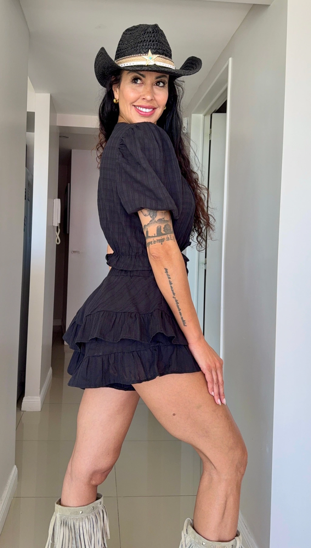 Este conjunto confeccionado en lino y brodery combina un short pollera con capas de volados y un elástico grueso en la cintura para un ajuste cómodo y estilizado.